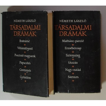 Társadalmi drámák I-II. Szépirodalmi 1964, Budapest Tartalom (I. kötet:) Bodnárné, Villámfénynél, Pusztuló magyarok, Papucshős, Cseresnyés, Győzelem. (II. kötet:) Mathiász-panzió, Erzsébet-nap, Szörnyeteg, Utazás, Nagy család, Sámson. |