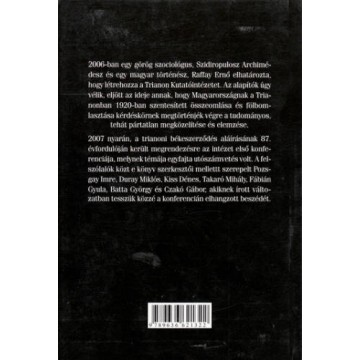 Trianon átírta Európát Kairosz 2008, Budapest A kötet két szerkesztője 2007 augusztusában alapította meg a Trianon Kutatóintézetet, melynek fő célja, hogy Magyarországnak a Trianonban 1920-ban szemtesített fölbomlasztása és összeomlása után megtörténjék a kérdéskör tudományos, tehát pártatlan megközelítése és elemzése. A kötetben megszólal Pozsgay Imre, Duray Miklós, Batta György, Kiss Dénes, Skultéty csaba, Takaró Mihály és Czakó Gábor is. |